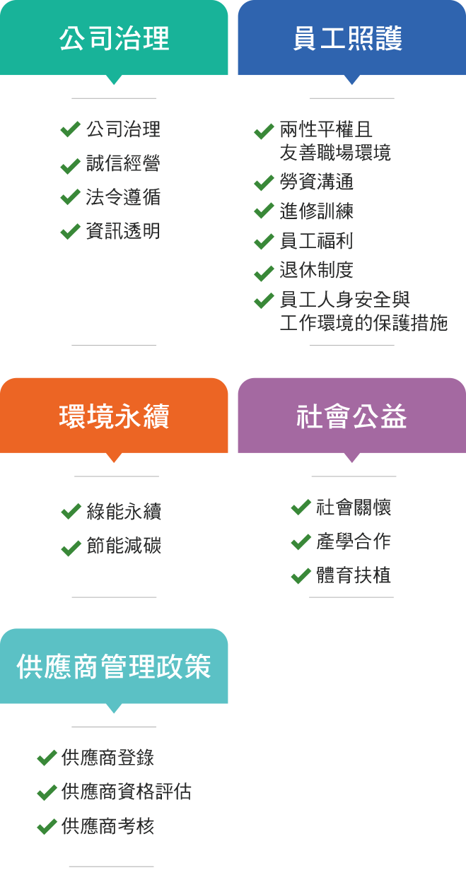 本公司建立永續供應商管理制度,除重視與供應商的穩定合作關係外,亦關注供應商在誠信經營、供應之品質、協同作業能力、環境保護與職安與勞工人權的落實程度。