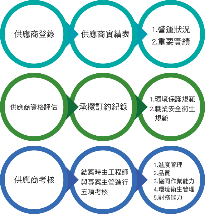 - 與供應商交易前皆會先進行適當評估並請供應商填寫供應商實績表,考慮供應商在品質、環境、配合情形及財務狀況,並將供應商過去有無影響環境與社會之紀錄納入日後供應商選擇之考量。供應商應針對案件屬性要求,須備齊備查文件及合格證照,如:勞工安全、衛生管理人員、營造作業主管、危險性機械設備檢查合格證照及現場安衛管理與缺失懲處措施。