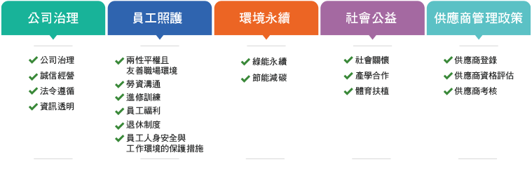 愛山林企業社會責任發展方向將朝「公司治理」、「員工照護」、「環境永續」、「社會公益」及「供應商管理政策」發展。