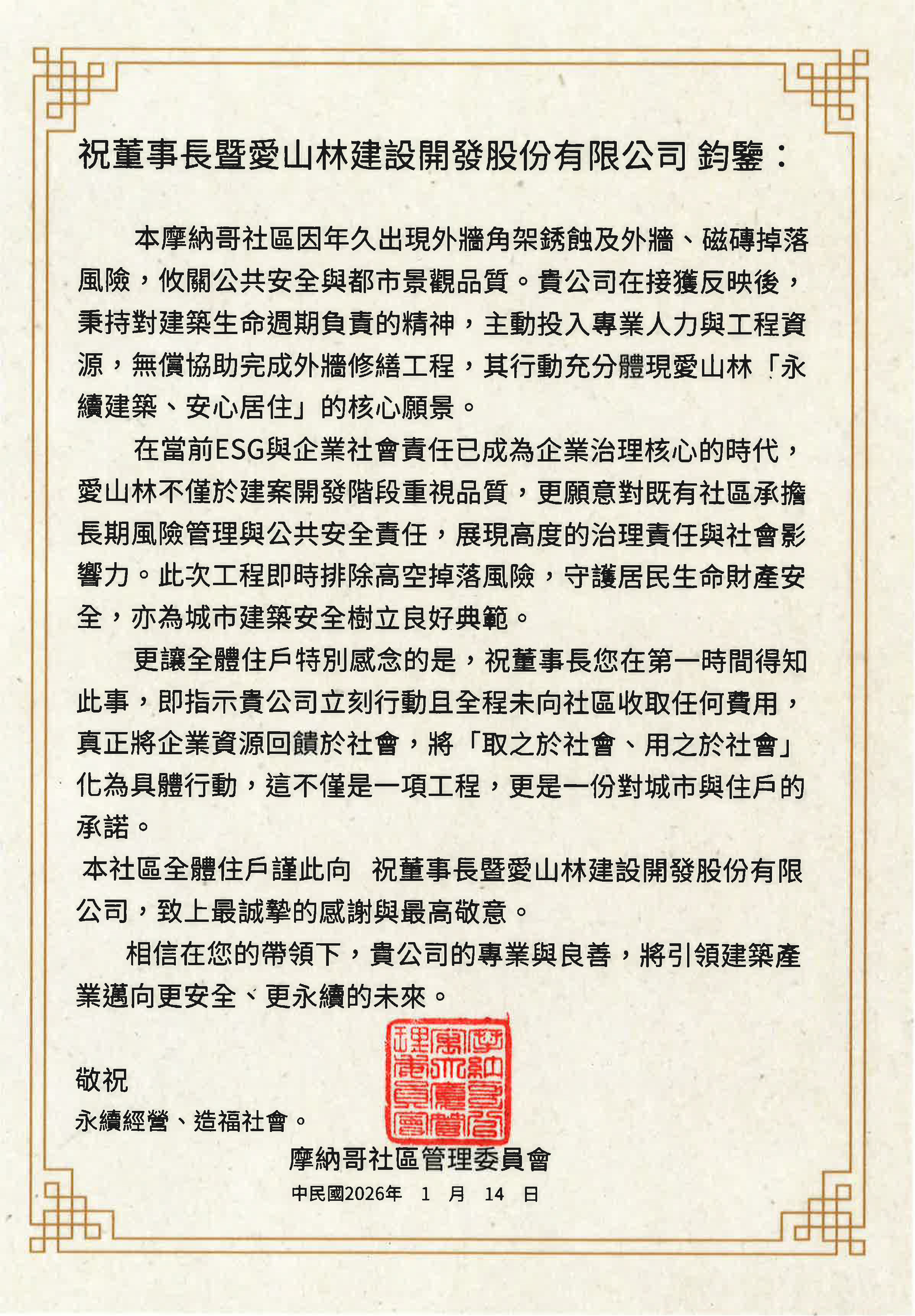 愛山林不僅在開發階段嚴守品質管理,更將住戶的生命財產安全視為終身責任。即便本案早已超過法定保固期,此次修繕作業仍採全額無償方式進行,展現我們對城市公共安全與住戶權益的高度重視。